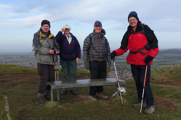 Four rugged chaps on top of High Cliff Nab, - Edward,Cliff, Roland & Alan. 20 years ago this little bench was surrounded by trees, offering a shaded spot to sit and eat your sandwiches. Sit there now and you are in a howling gale. |