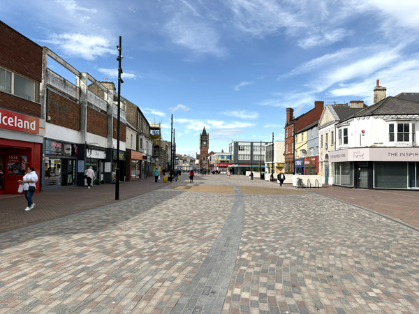 Redcar's High Street looking West towards the Town Clock, - a memorial to King Edward VII.