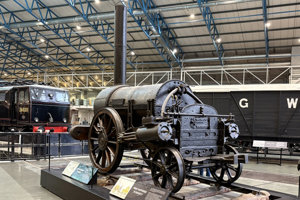The original 200 year old "Rocket" locomotive built by Robert Stephenson. Nearby is a restored version painted yellow, with a similar restored version in the Railway Museum at Shildon.